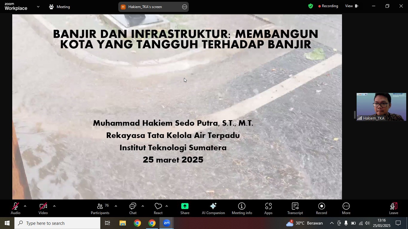 Jakarta, 21 April 2025. PERTAPIN melaksanakan Webinar Series #2 PERTAPIN Tahun 2025 dengan tema “Banjir Dan Infrastruktur: Membangun Kota Yang Tangguh Terhadap Air”. Kegiatan ini dilaksanakan pada tanggal 25 Maret 2025 yang diikuti oleh 108 peserta melalui virtual zoom meeting, baik dari unsur anggota PERTAPIN maupun umum. Hadir sebagai Narasumber, yaitu Bapak Muhammad Hakiem Sedo Putra, S.T., M.T. selaku Dosen Rekayasa Tata Kelola Air Terpadu - Institut Teknologi Sumatera (Itera) yang dimoderatori oleh Bapak Apriadi Herlambang, S.T., M.Pd. selaku Asesor Kompetensi LSP Konstruksi Pertapin Raya. Kegiatan ini dilaksanakan dalam 2 (dua) sesi, yaitu sesi pemaparan materi dan juga sesi tanya jawab yang dimulai pada pukul 13:00 WIB dan berakhir pada pukul 15:00 WIB.
