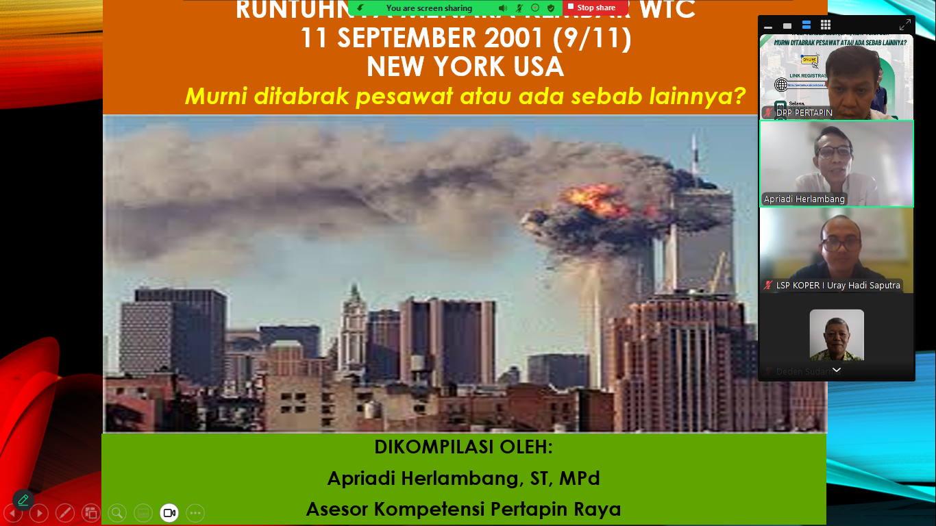 Jakarta, 29 Agustus 2025. PERTAPIN melaksanakan Webinar Series #3 PERTAPIN Tahun 2025 dengan tema “Runtuhnya Menara Kembar WTC 11 September 2001 (9/11) New York USA, Murni Ditabrak Pesawat atau Ada Sebab Lainnya?”. Kegiatan ini dilaksanakan pada tanggal 27 Mei 2025 yang diikuti oleh 55 peserta melalui virtual zoom meeting, baik dari unsur anggota PERTAPIN maupun umum. Hadir sebagai Narasumber, yaitu Bapak Apriadi Herlambang, S.T., M.Pd. selaku Asesor Kompetensi LSP Konstruksi Pertapin Raya, yang dimoderatori oleh Bapak Uray Hadi Saputra, S.T. selaku Ketua LSP Konstruksi Pertapin Raya. Kegiatan ini dilaksanakan dalam 2 (dua) sesi, yaitu sesi pemaparan materi dan juga sesi tanya jawab yang dimulai pada pukul 13:00 WIB dan berakhir pada pukul 15:00 WIB.