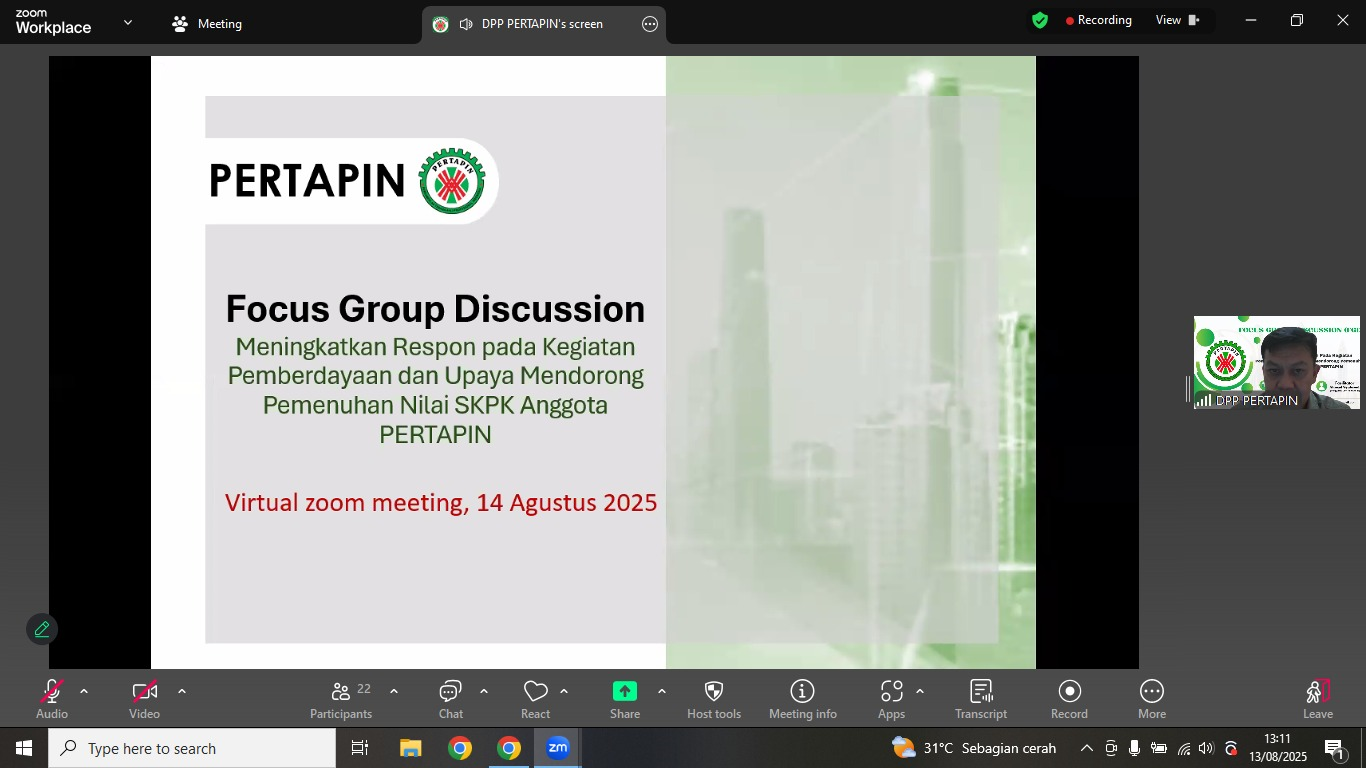Jakarta, 29 Agustus 2025. Perkumpulan Tenaga Ahli Profesional Indonesia selenggarakan Focus Group Discussion (FGD) Tahun 2025. Kegiatan FGD ini mengangkat tema “Meningkatkan Respon pada Kegiatan Pemberdayaan dan Upaya Mendorong Pemenuhan Nilai SKPK Anggota PERTAPIN”. Kegiatan FGD ini dilaksanakan pada tanggal 13 Agustus 2025 yang dihadiri oleh 28 peserta melalui virtual zoom meeting dari Ketua/ plt. Ketua DPD PERTAPIN dan juga anggota PERTAPIN, yang di-fasilitatori oleh Bapak Ahmad Syahroni selaku Pengurus DPP PERTAPIN. Pada FGD Tahun 2025 yang telah dilaksanakan, para peserta telah memberikan masukan terkait waktu pelaksanaan dan kegiatan pemberdayaan anggota untuk menambah nilai SKPK SKK Kualifikasi Ahli tersebut.